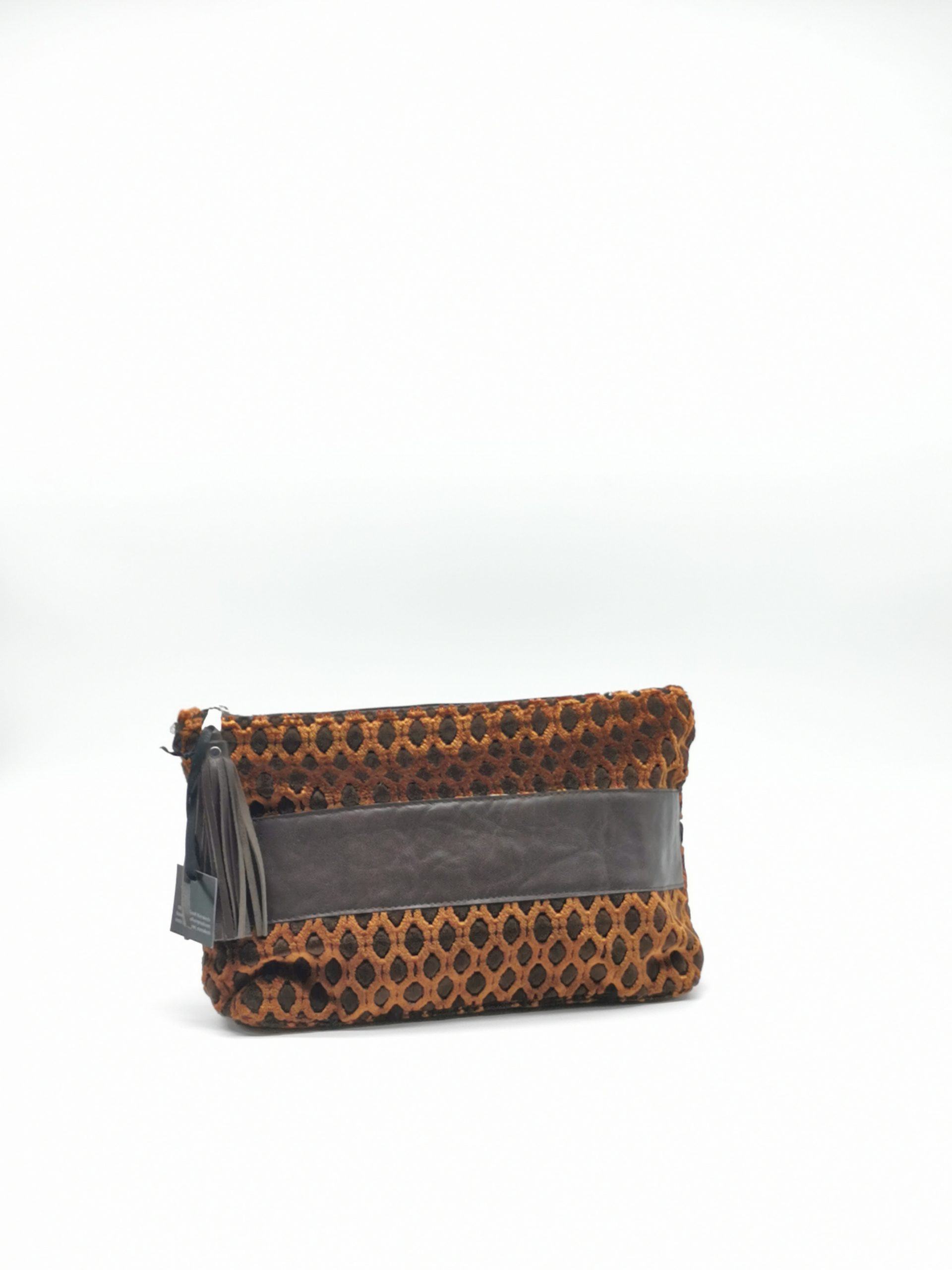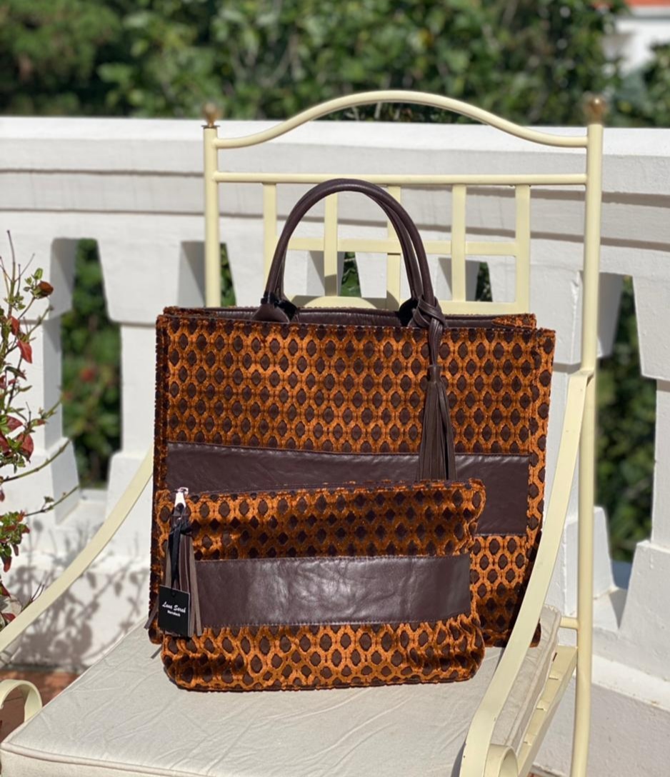 Fabriqué en tissu velours et cuir, de couleur marron et safran doré