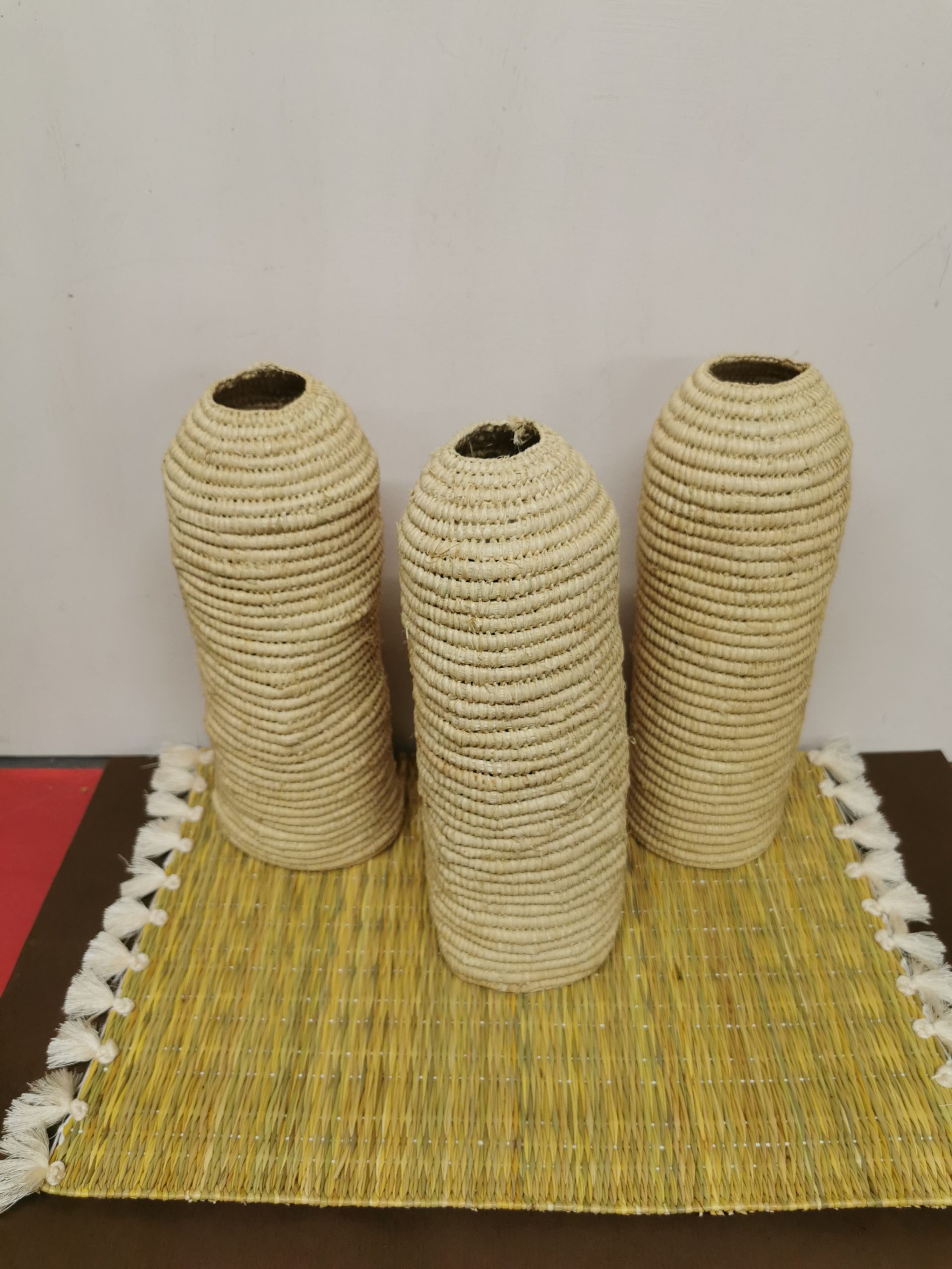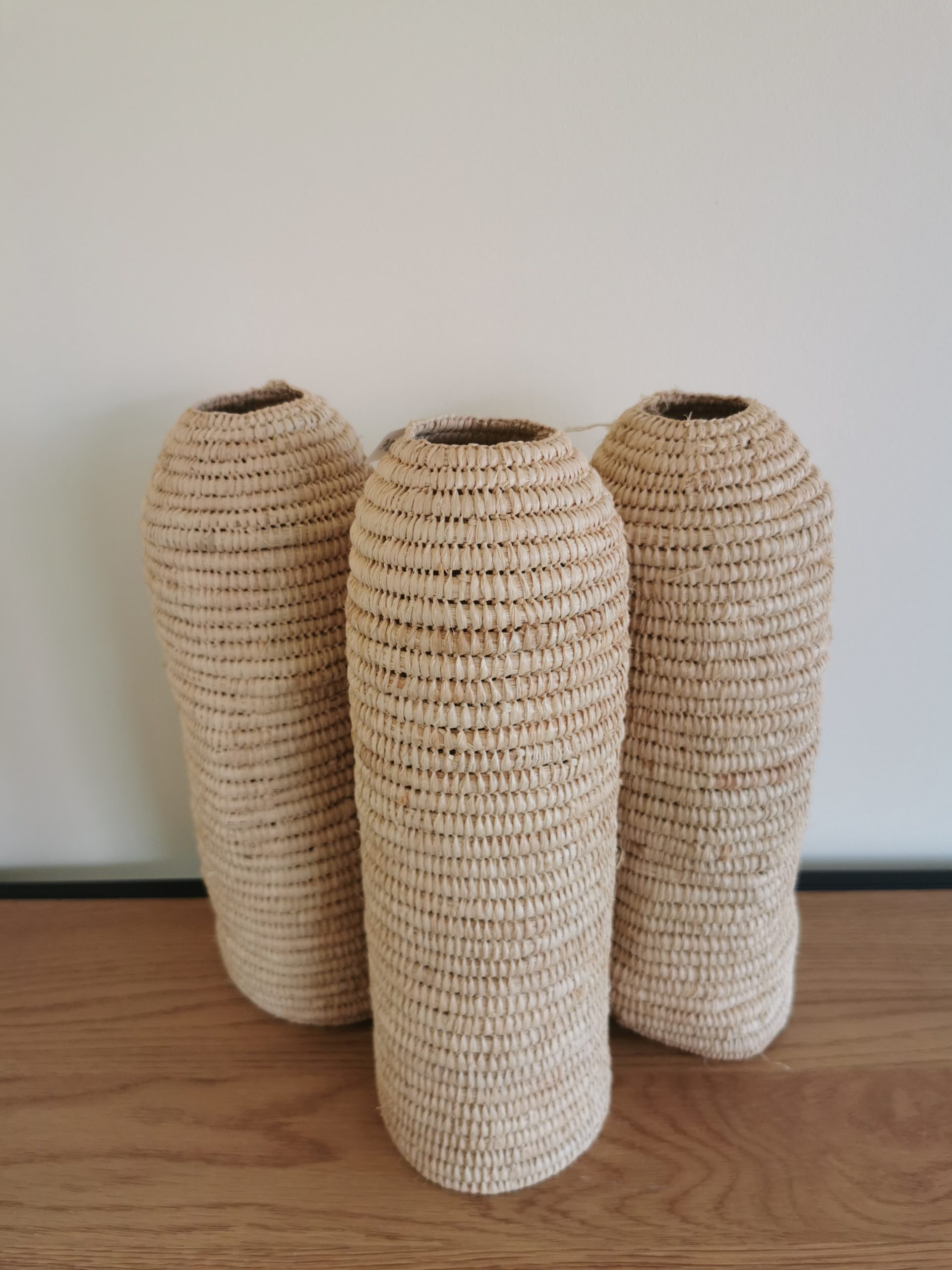 Une super idée pour cacher vos bouteilles en plastique ou en verre ! Le cache bouteille convient à des contenants de 1,5 litres et donnera du chic sur votre table. On ne se lasse pas de ces créations faites par ces artisans marocains tellement doués de leurs mains. La douce couleur dorée du raphia s’accordera avec tous les styles de table.
