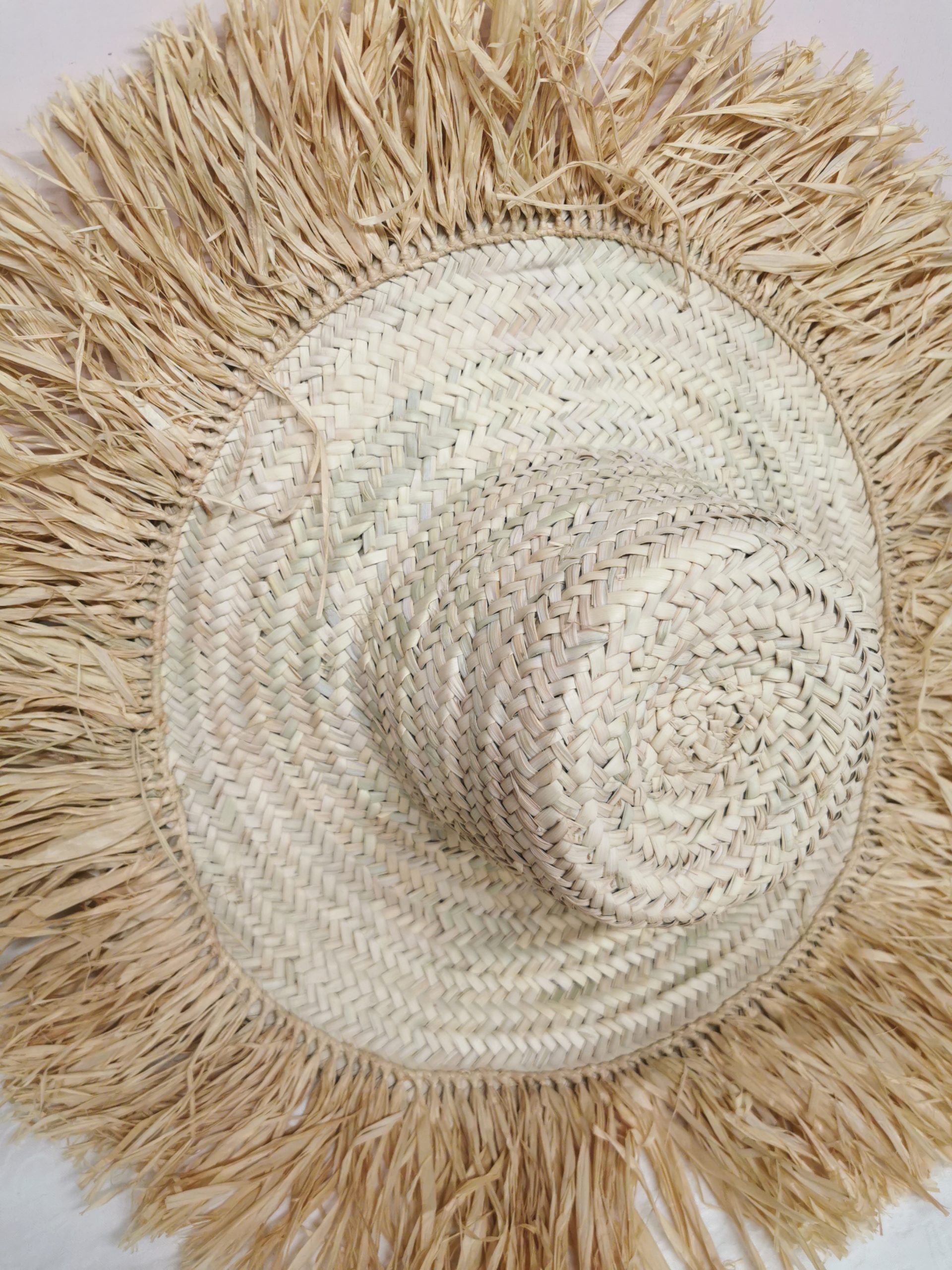 En feuilles de palmier tressé et franges en raphia.