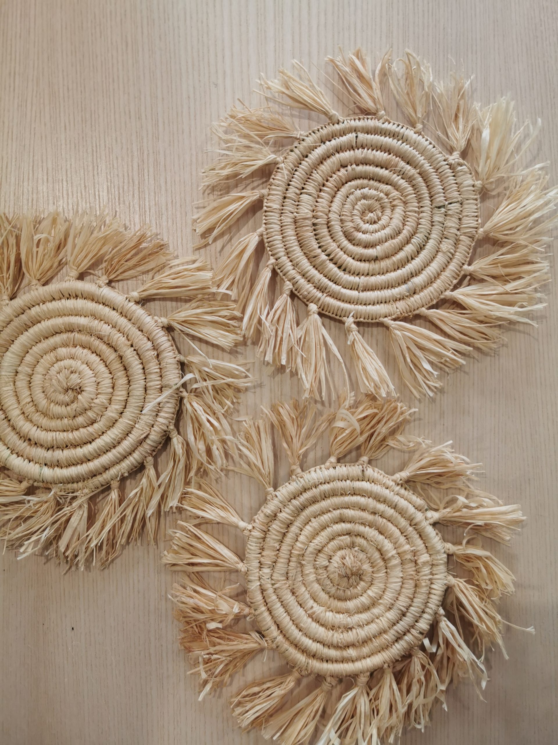 Voilà une belle idée bohème pour décorer vos tables de l’été ! Ces dessous de verre en raphia feront sensation sous des verres, vases ou sur vos murs. La finition avec les petites franges donne ce cachet qu’on adore !