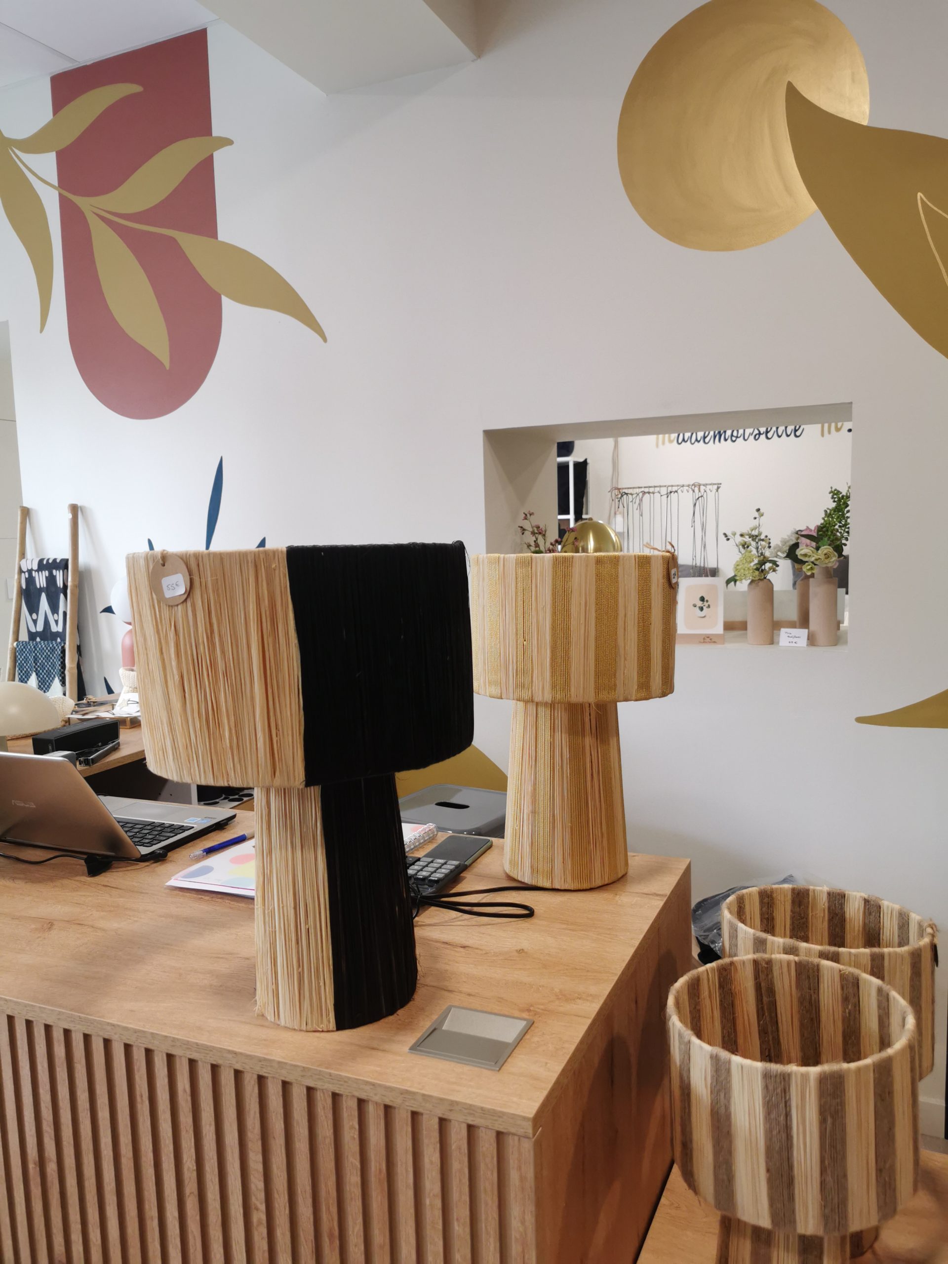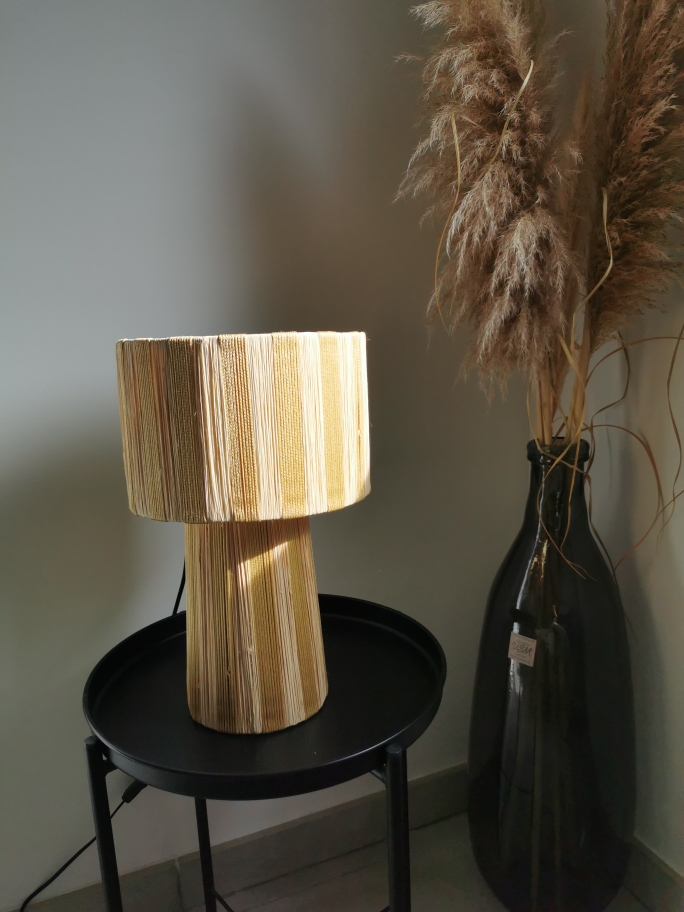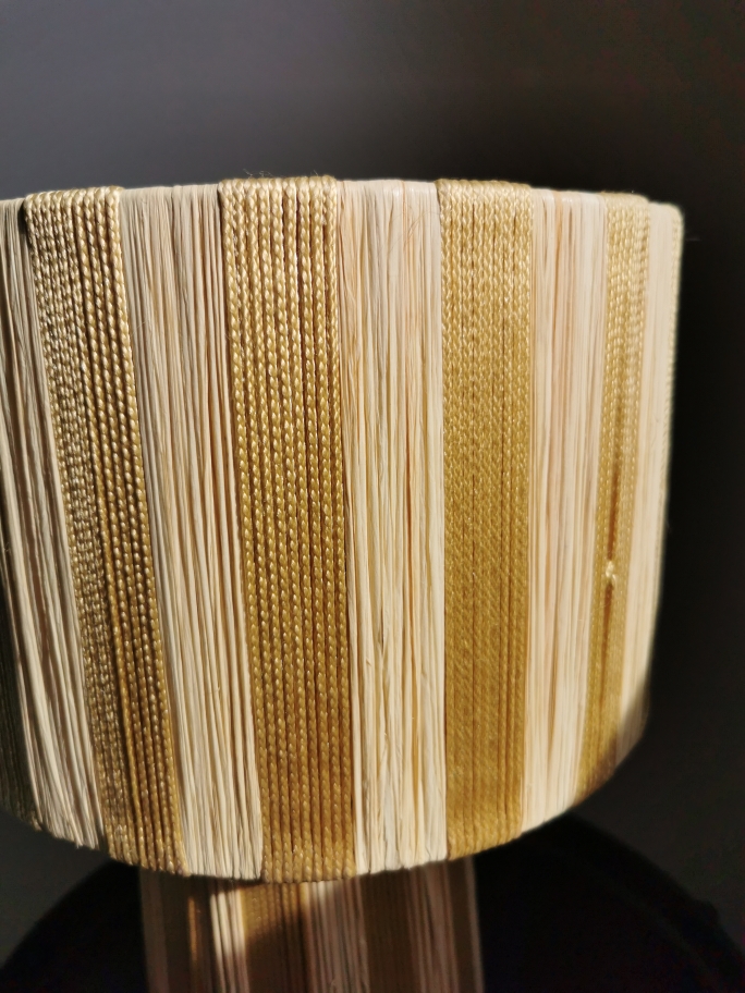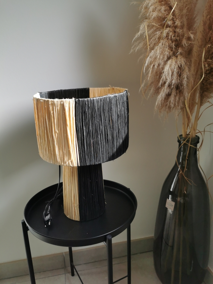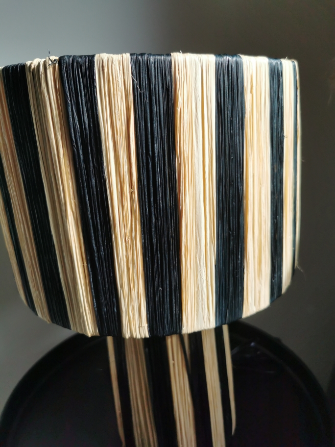 Nous avons adoré cet objet : une lampe en raphia, alterné de larges bandes noires ou plus fines ou bien dorées.