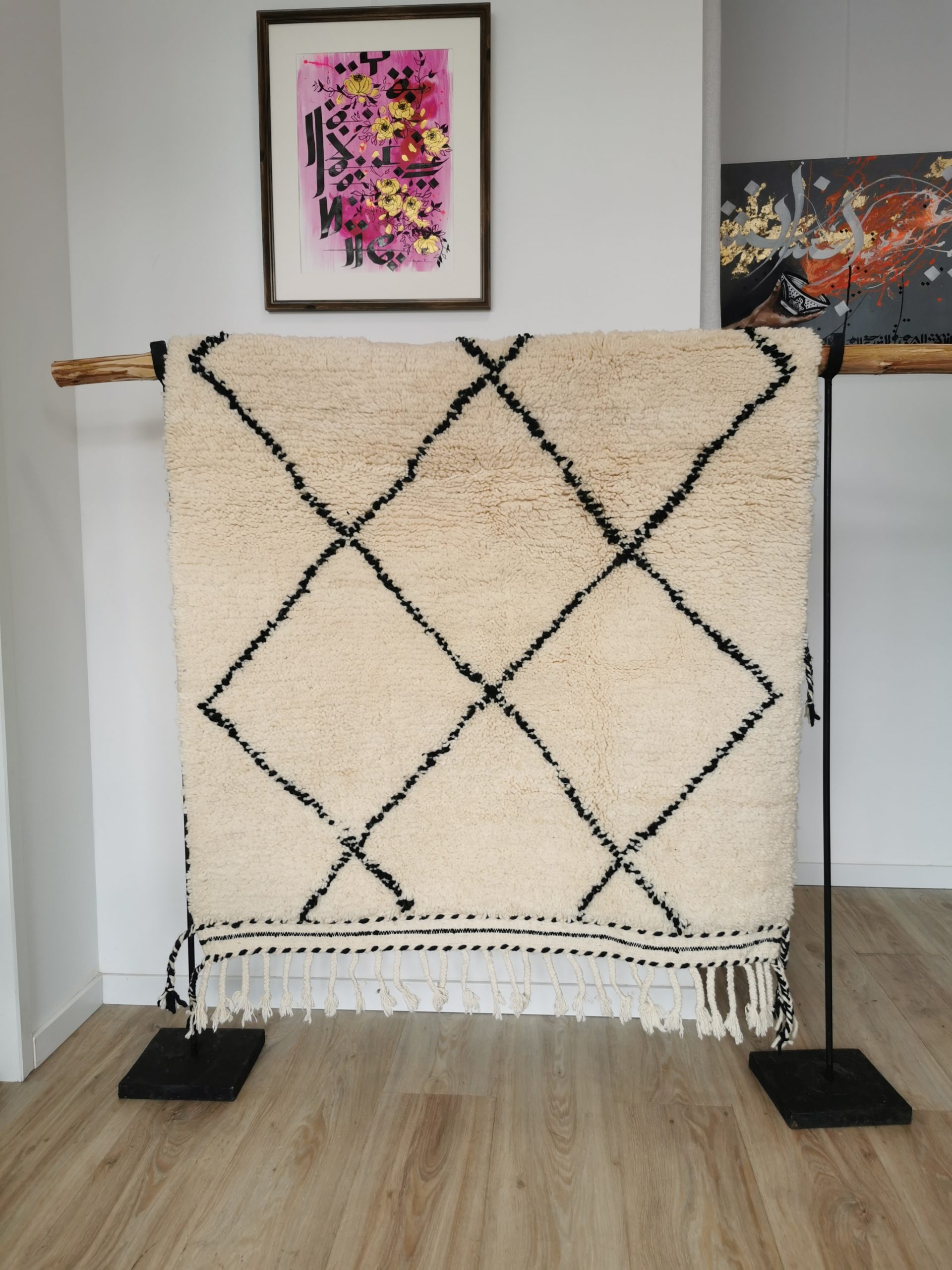 Magnifique tapis Berbère BENI OUARAIN tissé dans le Haut Atlas marocain par la tribu berbère du même nom. Ce sont des tapis épais ( entre 2,5 et 3 cm), moelleux fabriqués à 100% avec de laine de moutons vivants dans les pâturages autours des villages. Traditionnellement ils sont écrus avec des motifs géométriques ou naturels, la laine est seulement lavée et non traitée.